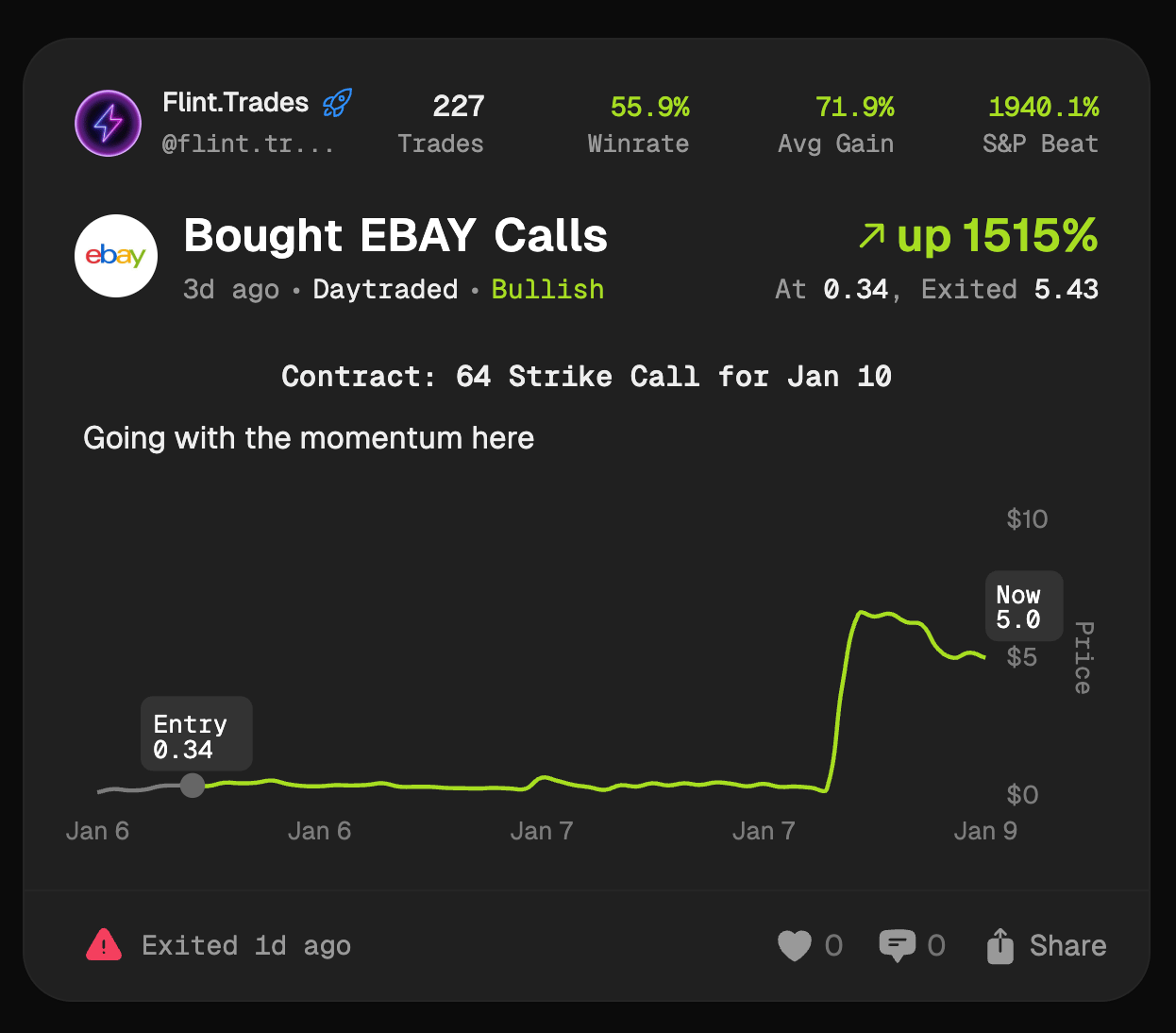 This week, one of our top pros—drumroll please—Flint shared an incredible trade. Flint posted a Call Option on $EBAY expiring on January 10th, 2025.