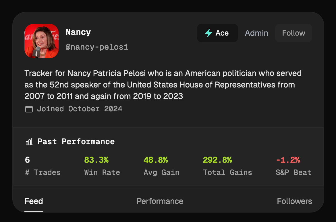 Well, I think most of the data that exists out there, apart from a few platforms, is super limited as to what it shows. Most of the time, you’ll see big claims about some congressman or woman beating markets by a large margin. But many times, those are just sensational headlines without much truth. Want me to demonstrate this? Look at the metrics below for Nancy Pelosi’s trades over the last 2 years.